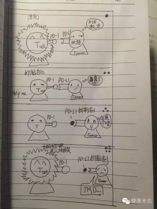 T細胞的哨兵就是PD-1,癌細胞辦假證(證件就是PD-L1),所以哨兵被騙了。PD-1單抗藥物就是憲兵,過去跟哨兵(PD-1)說,瞎眼啦,你倆別握手了,這丫的是癌細胞,干掉丫的。然后T細胞就去把癌細胞弄死了。