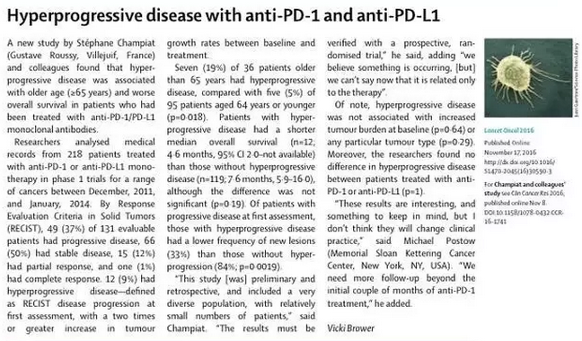 最近一期柳葉刀雜志發(fā)表評論文章,法國研究人員Champiat等發(fā)現(xiàn)大于65歲的病患接受PD-1/PD-L1單抗治療過程中出現(xiàn)腫瘤的超快進(jìn)展現(xiàn)象,而且總體生存率也較差。