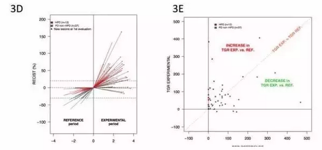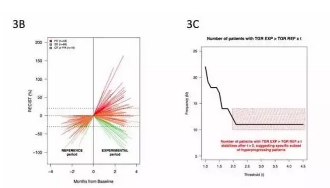 為了識別出癌癥疾病進(jìn)展了的群體,研究人員計算了滿足以下條件的患者數(shù):治療后的TGR> 治療前TGR x t,其中t是整數(shù)閾值(從1到5)。t為2,3,4,5的就是疾病高度進(jìn)展了的患者(HPD)。