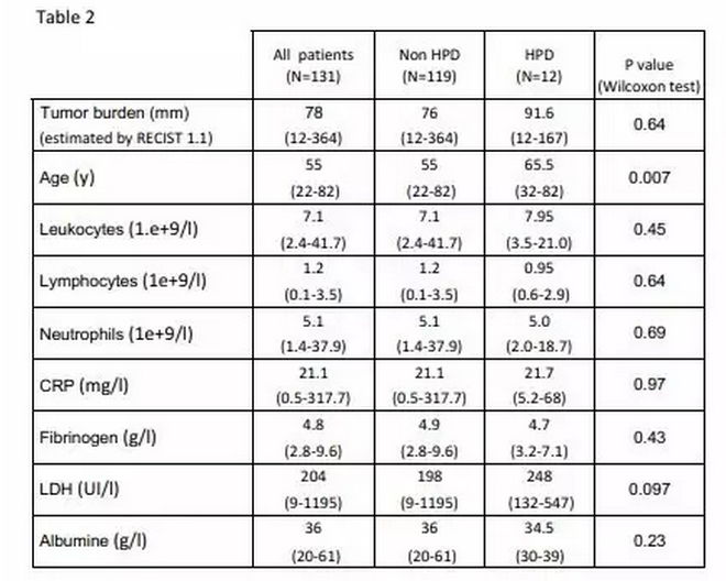 我們觀察到HPD相比非HPD患者年齡更高,這是非常值得重視的。這可能是老年患者與年輕患者有著不同的免疫學(xué)背景的原因,比如T細(xì)胞共刺激/共抑制蛋白表達(dá),以及更高的炎癥細(xì)胞因子的濃度。同時,這與之前三個獨立報道的三期臨床實驗中老年人從藥物中受益較少的結(jié)果是一致的,這其中的機制非常值得研究。