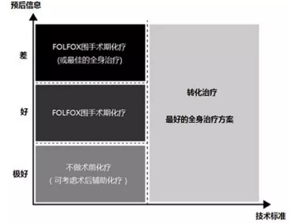 也許是由于循證醫(yī)學(xué)證據(jù)的缺乏,既往的ESMO指南一直沒有推薦靶向藥物用于初始可切除mCRC的新輔助治療,直到2015/2016年度,ESMO指南在初始可切除mCRC圍手術(shù)期治療模式的選擇上,版指南做了比較大的更改,明確提出要從"手術(shù)技術(shù)標(biāo)準(zhǔn)"和"腫瘤學(xué)預(yù)后因素"兩個(gè)維度進(jìn)行考量(圖-1)。