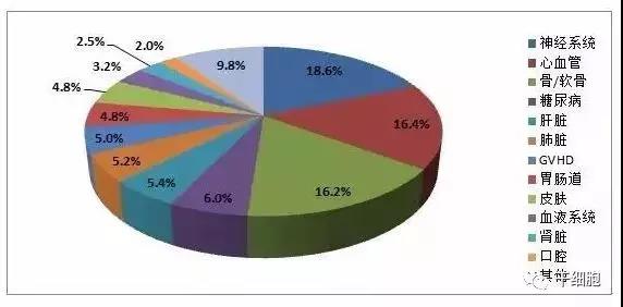 從治療的疾病種類來(lái)看,間充質(zhì)干細(xì)胞的臨床研究涉及上百種疾病(表3)。將這些疾病按照器官系統(tǒng)分類,可以發(fā)現(xiàn)神經(jīng)系統(tǒng)、心血管和骨科疾病是三類主要的研究領(lǐng)域,占比都在15%以上,總和超過(guò)一半。另外,糖尿病、肝臟、肺臟、胃腸道、皮膚和移植物抗宿主?。℅VHD)的比例都在5%左右,是間充質(zhì)干細(xì)胞重要的臨床研究方向。