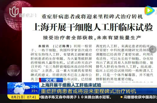 2005年,我國(guó)第一例干細(xì)胞移植治療肝硬化在北京軍區(qū)總醫(yī)院完成。42歲的河南患者邢先生到醫(yī)院就診時(shí)已經(jīng)全身黃疸,肝腹水,生命岌岌可危。醫(yī)院的姚鵬主任用一根導(dǎo)管通過(guò)股動(dòng)脈,把自體骨髓干細(xì)胞懸液送到患者肝臟。一周后,患者狀態(tài)明顯轉(zhuǎn)好,腹水消失,能進(jìn)食了,走路有勁了。5個(gè)月后到醫(yī)院復(fù)查,黃疸指數(shù)等八項(xiàng)生化指標(biāo)全部恢復(fù)正常,原先已經(jīng)萎縮的肝臟竟長(zhǎng)大了一圈。