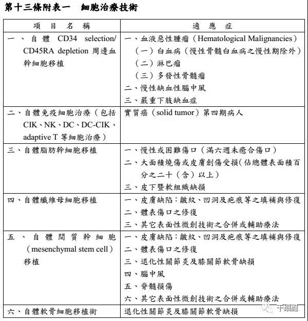 適應(yīng)癥則分別有白血病、淋巴瘤、多發(fā)性骨髓瘤、慢性缺血性腦中風(fēng)、嚴(yán)重下肢缺血、實(shí)質(zhì)癌第四期、大面積燒傷或皮膚創(chuàng)商、體表傷口填補(bǔ)、脊髓損傷、退化性關(guān)節(jié)炎及膝關(guān)節(jié)軟骨缺損等。