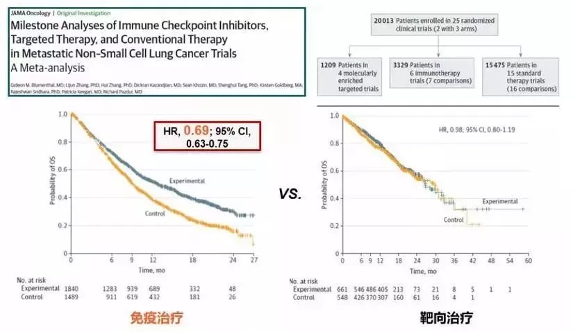 2017年,JAMA ONC曾經(jīng)發(fā)過(guò)一篇經(jīng)典文章,通過(guò)對(duì)非小細(xì)胞肺癌的25個(gè)臨床試驗(yàn),2萬(wàn)多名患者的大數(shù)據(jù)分析,發(fā)現(xiàn)參與免疫療法和靶向療法的患者,生存曲線非常不同。