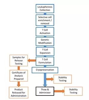 自體回輸?shù)腃AR-T制備工藝經(jīng)過:T細(xì)胞采集及儲存-T細(xì)胞的富集-T細(xì)胞激活-T細(xì)胞轉(zhuǎn)導(dǎo)修飾-T細(xì)胞擴增-成品CAR-T儲存等。質(zhì)量控制和檢測環(huán)節(jié)貫穿整條工藝線。在整個工藝流程中,有幾個關(guān)鍵環(huán)節(jié)和關(guān)鍵指標(biāo)需要注意。以下分析的基礎(chǔ)為已上市的兩款CAR-T產(chǎn)品和中國食品藥品檢定研究院發(fā)布的CAR-T的生產(chǎn)考慮要點。