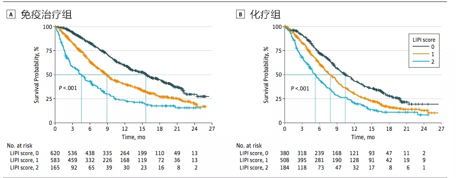 化療:LIPI為0的患者,生存期33.4個月;LIPI為2的患者,生存期只有17.1個月,近兩倍的差異;
